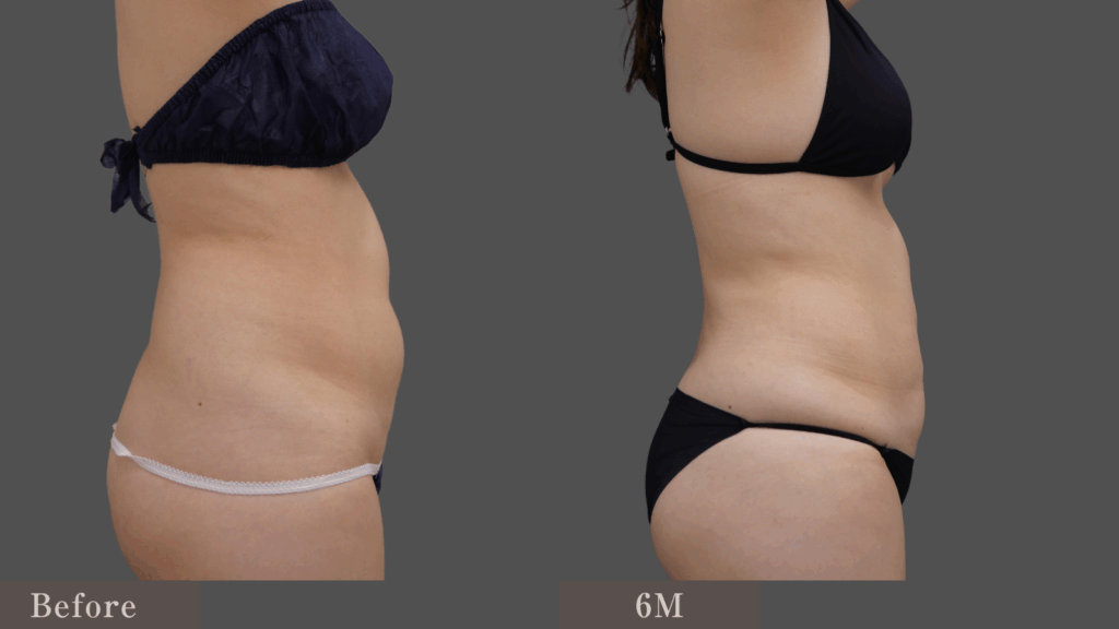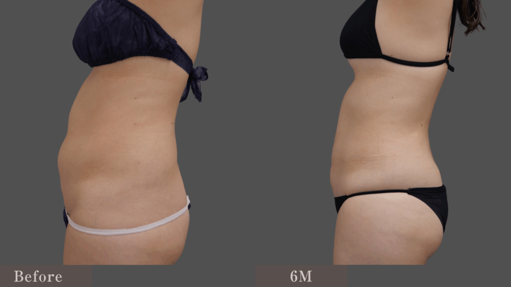 横から見ると、前後の厚みがかなり減りました。お腹と合わせて腰の吸引をしたことがとても効いています。